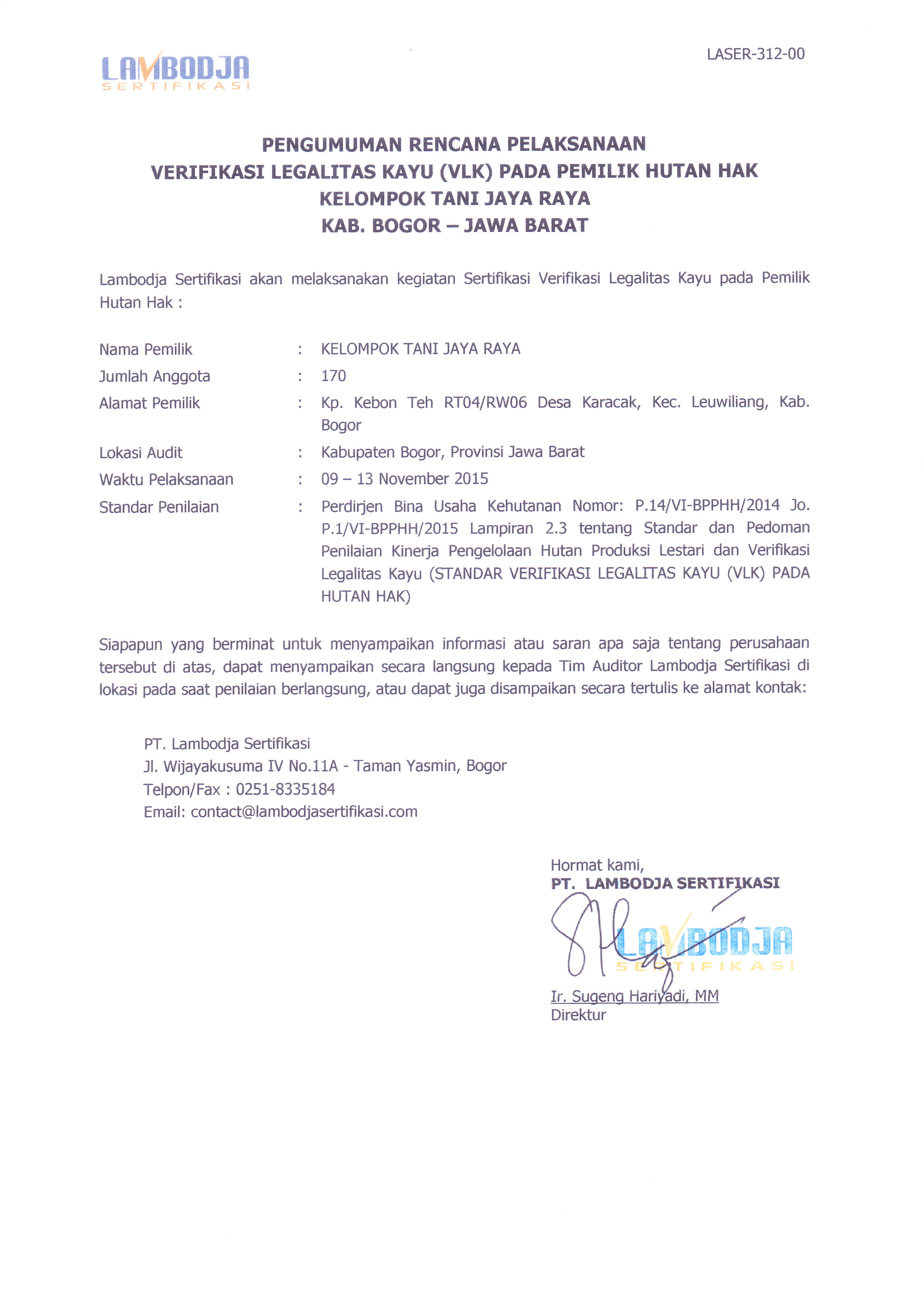 Pengumuman Rencana VLK Hutan Hak Kelompok Tani Jaya Raya