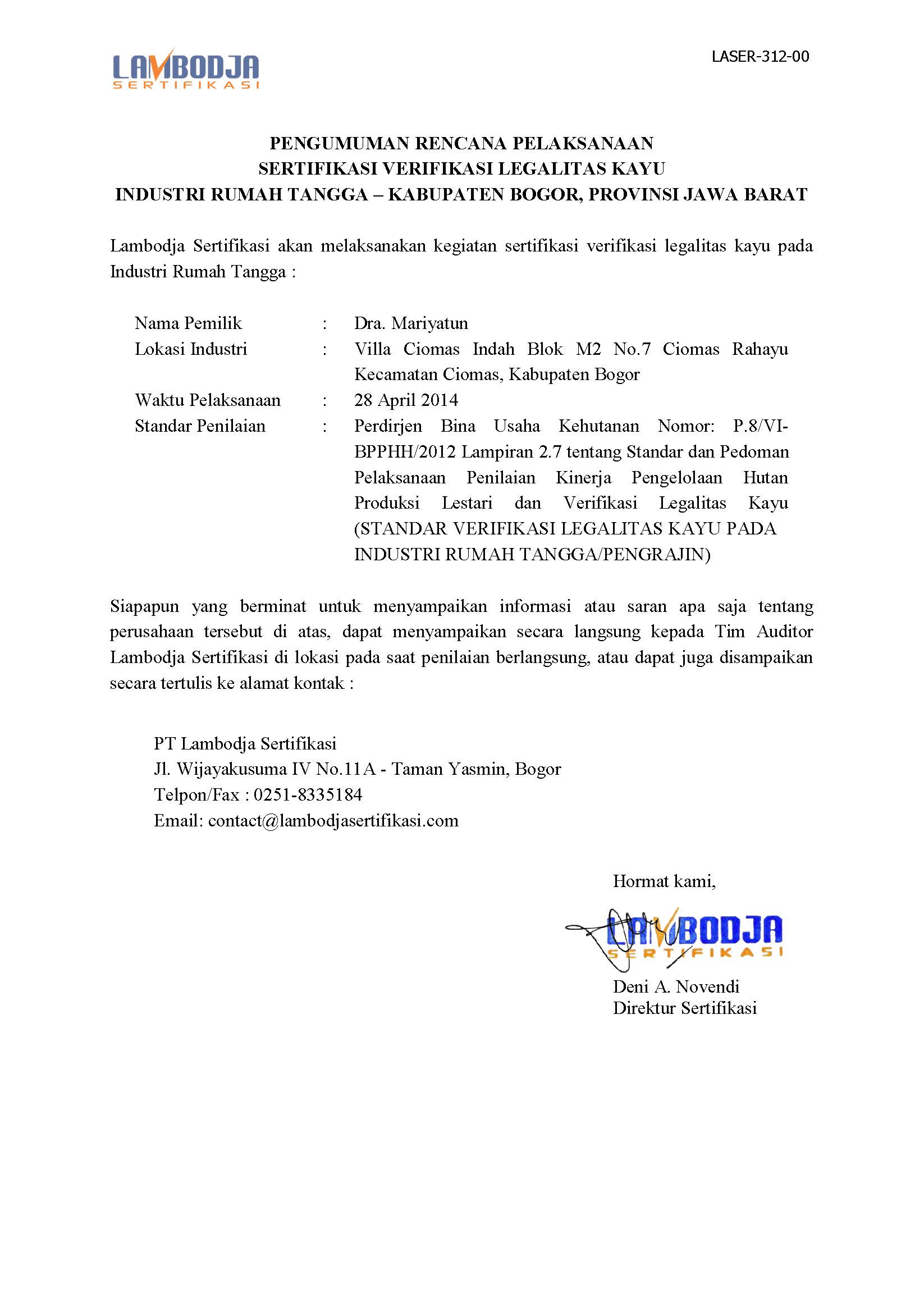 Pengumuman Rencana VLK Industri Rumah Tangga a/n Mariyatun