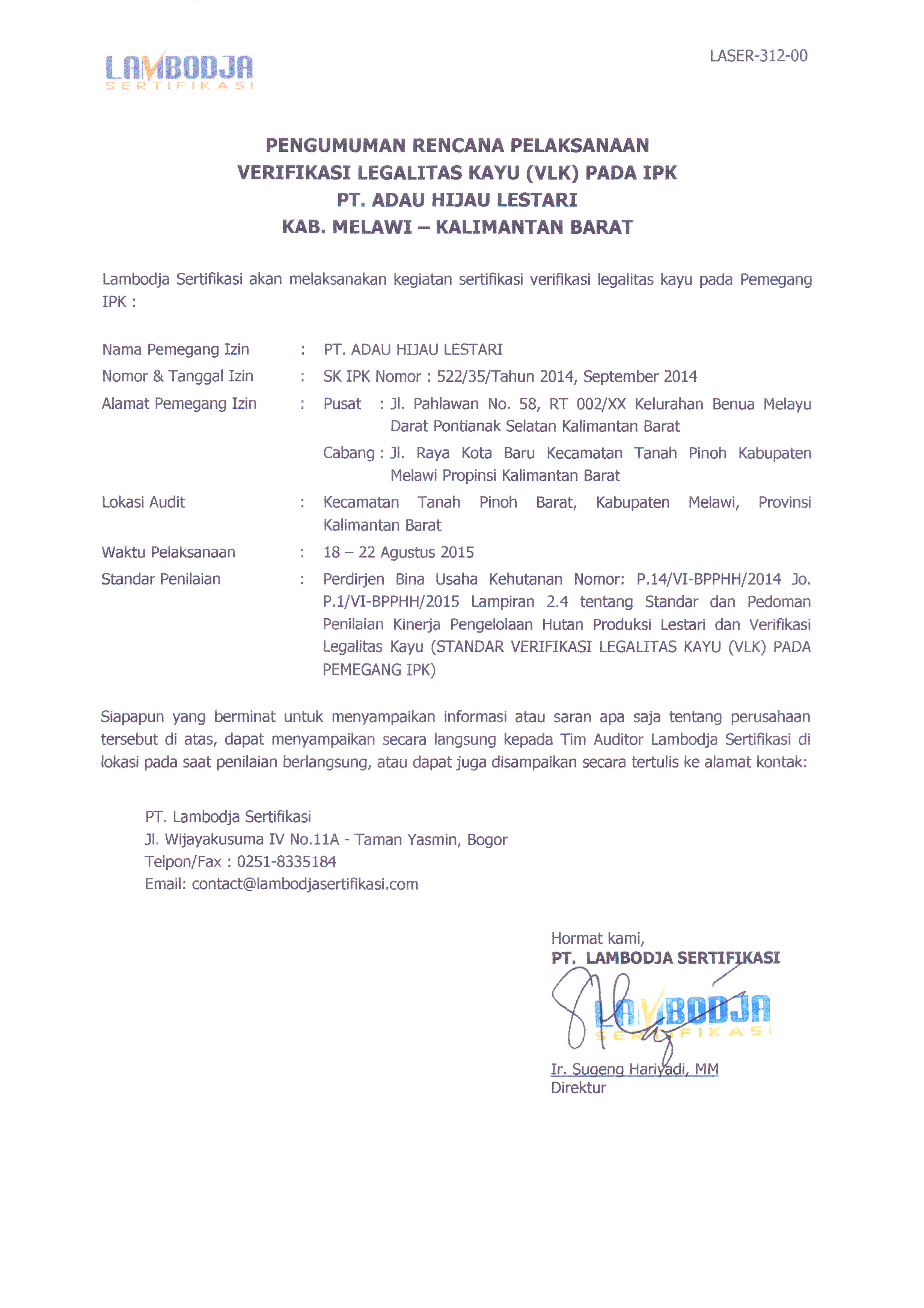 Pengumuman Rencana VLK IPK PT. Adau Hijau Lestari