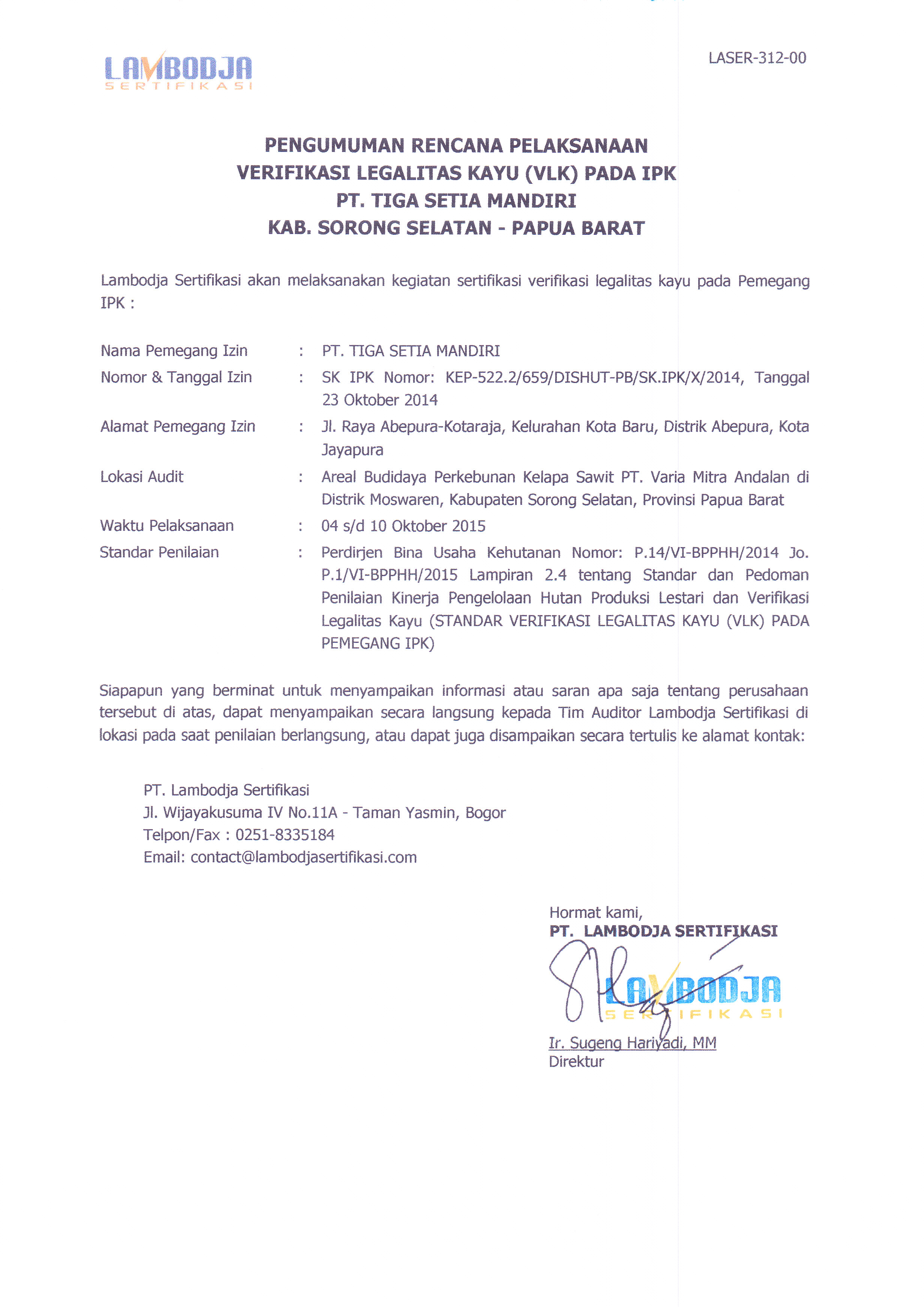Pengumuman Rencana VLK IPK PT. Tiga Setia Mandiri