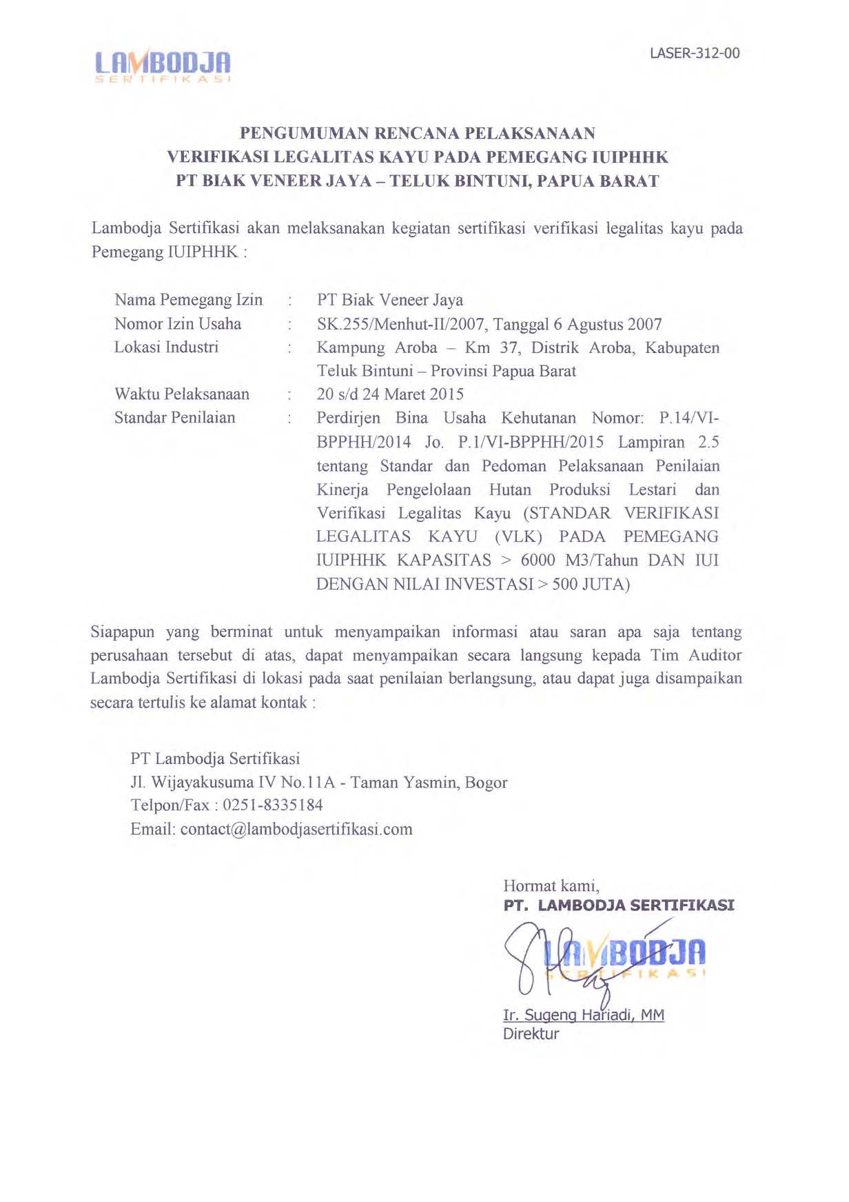 Pengumuman Rencana VLK PT Biak Veneer Jaya