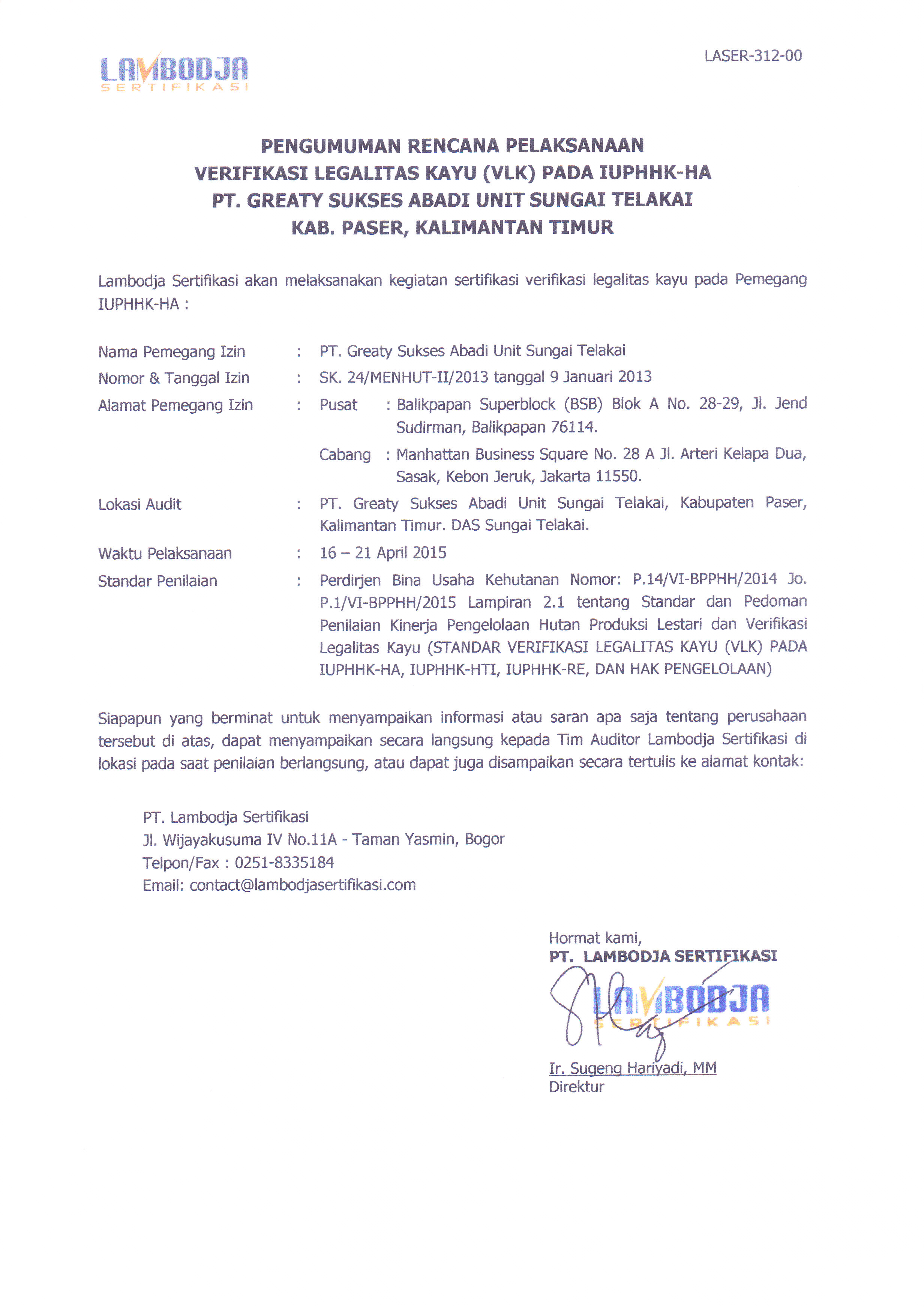 Pengumuman Rencana VLK PT Greaty Sukses Abadi Unit Sungai Telakai