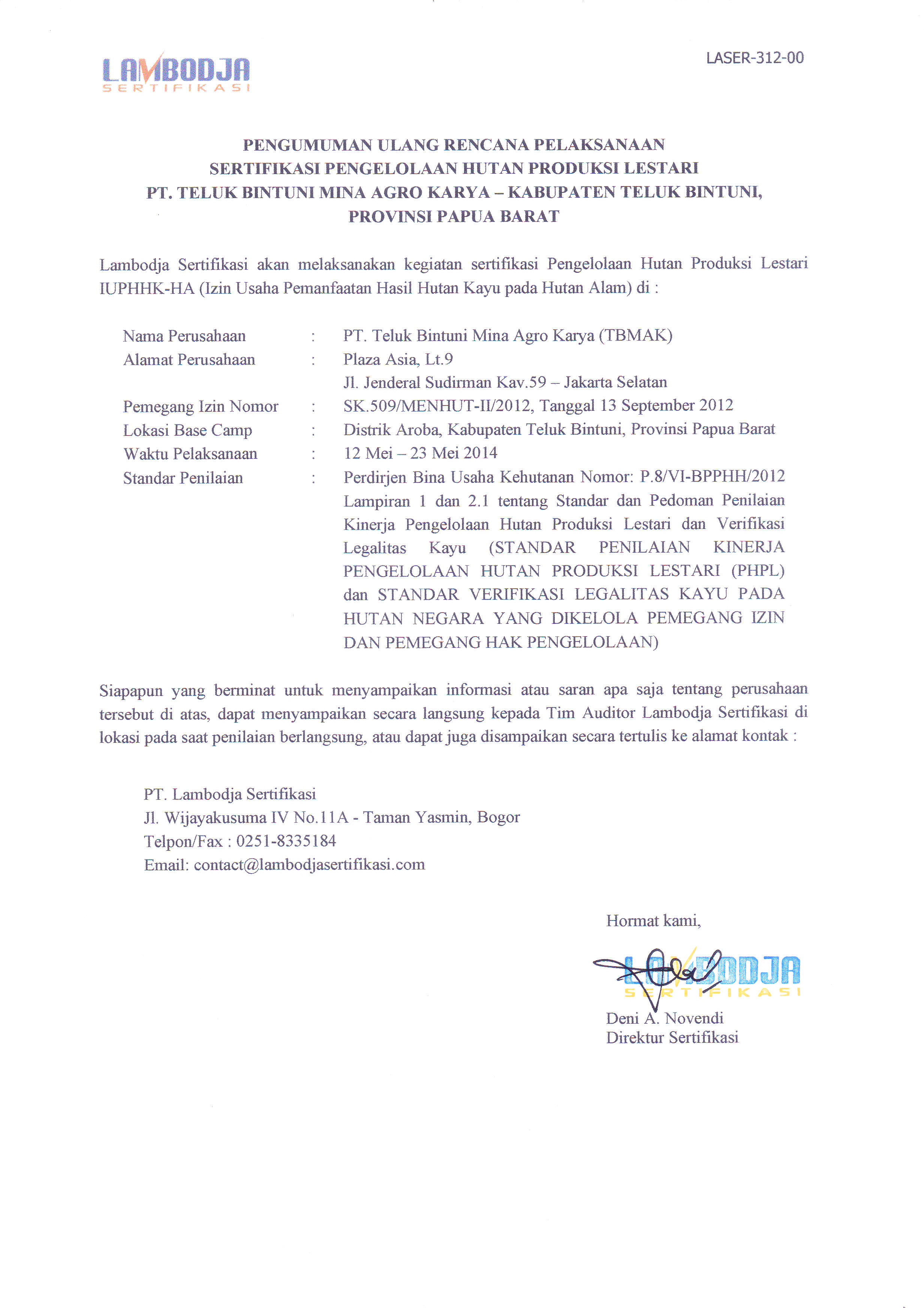 Pengumuman Ulang Rencana PHPL PT Teluk Bintuni Mina Agro Karya
